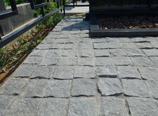 Далее мы привозим гранит для подставки под памятник, балки цветника и брусчатку. Для того, чтобы брусчатка не разваливалась в последствии по бокам, мы обвариваем периметр под оградой металлической полосой. После установки гранита и брусчатки могила выглядит следующим образом.