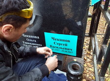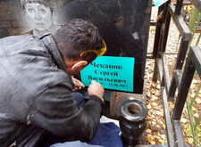 по приезду на кладбище мы промерили уже нанесённые на памятник надписи, затем по их образу и подобию изготовили идентичный трафарет, который наклеили на надгробье.