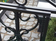Покрасить ограду, так как чаще всего при установке ограды красят транспортировочной краской, которая приходит в негодность через год. Облицевать бетонный цоколь и бетон обрамляющий цветник. В данном случае для этого мы использовали керамогранит. Установили гранитные лавочку и столик. Посадили две туи и кустовые хризантемы в цветник. Заменили пластиковую вазу на гранитную. Уложили гранитную брусчатку на пол.