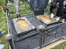 Первым делом мы очистили и разровняли территорию участка, установили новый металлический крест, выставили у подножья надгробий гранитные цветники, застелили площадь могилы геотекстилем.