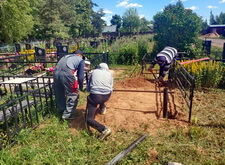 На каждом из четырёх углов вкручиваем сваи. Грунт на данной могиле попался твёрдый, после того, как сваи уже не вкручиваются, начинаем их забивать. Окончательно загнать сваи в землю так и не удалось, поэтому срезаем выступающие части. На качестве каркаса данное решение никак не отобразилось, так как длинна наших свай всегда несколько больше, чем требуется.