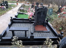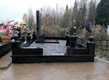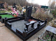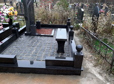 Завершающим этапом стала сборка оградки и укладка брусчатки. Ограждение мы создали из находившихся на могиле секций, кое где закрепив отломавшиеся навершия на разделительные столбики. Перед памятником мы установили гранитный цветник и две траурные урны, а по правую сторону от входа поставили заказанную клиентом лавочку, тоже изготовленную из чёрного гранита. Брусчатку мы замыли водой, одновременно удаляя всю строительную пыль, образовавшуюся в процессе работы.