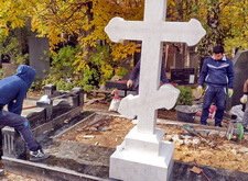 Далее мы установили мраморный крест, который отдельно приобретал сам клиент, а также вернули на место гранитное ограждение, предварительно его подрезав.
